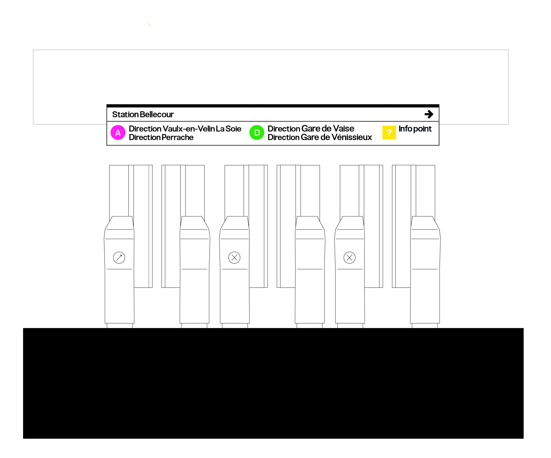 We chose to start signage for reception points outside the station in order to guide users as early as possible. Once in front of the payment terminals, a line on the floor starts from the call terminal and guides users continuously to their destination.
